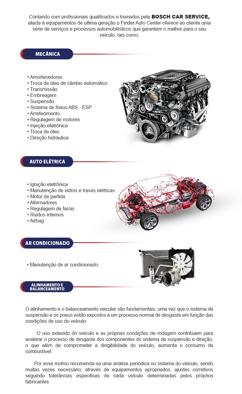 Há mais de 25 anos no mercado de Joinville, e fazendo parte da rede Bosch Car Service, o Finder Auto Center oferece soluções automobilísticas de acordo com suas necessidades. No Finder Auto Center, você dispõe de todos os serviços para seu carro em um único lugar, com a confiança, qualidade, tecnologia e tradição. Traga seu carro e desfrute de serviços rápidos e precisos, equipamentos de última geração, profissionais treinados pela Bosch e a garantia de peças originais.